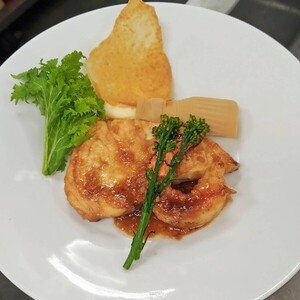 ふっくらと焼き上げたカジキマグロと海老を、和風のガーリックソースで仕上げました。裾野の新鮮野菜と一緒に是非ご賞味ください。